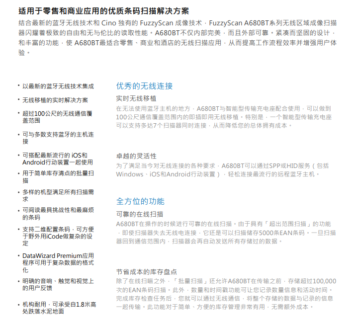 結合 εε最新的(de)藍(lán)牙無線技(jìσ•)術(shù)和(hé)Cino獨有(yǒu)的(de)FuzzyScan成像技(jì±)術(shù),FuzzyScan A680B©T系列無線區(qū)域成像掃描器(qì)閃耀著(zhe)極緻的(de)自(zì) ¥'€由和(hé)無倫比的(de)讀(dú)取性能(néng)。A680BT不(bù)™★僅內(nèi)部完美(měi),而且外(wài)部可(kě)靠。緊湊而堅固的(de)★₽設計(jì),和(hé)豐富的(de)功£"¶能(néng),使A680BT适合零售、商業(yè)₹₩♠和(hé)酒店(diàn)的(de)無線描應用(€→γ♠yòng),從(cóng)而提高(gāo)工(gōng)作(zuò)流程效率并增強用(yòng€≥)戶體(tǐ)驗。