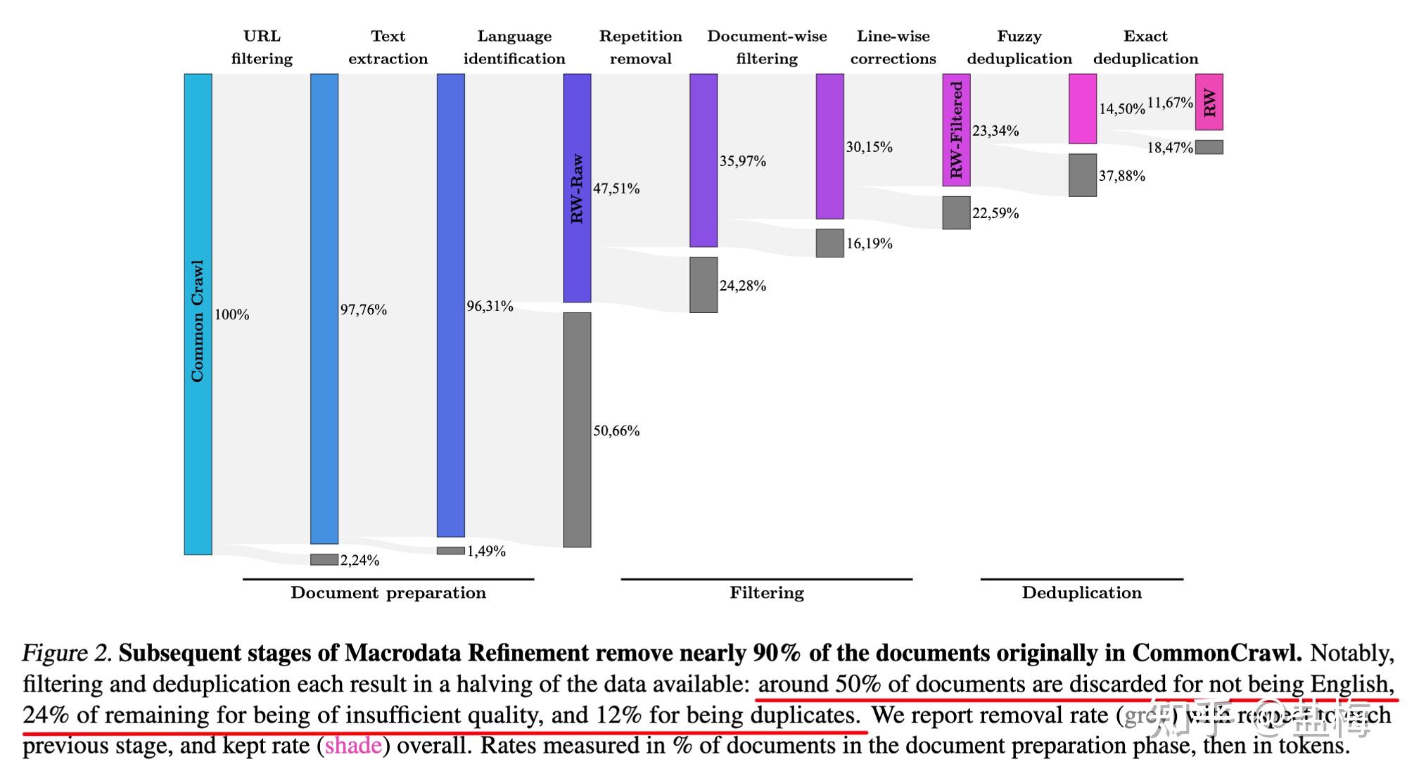 清洗步驟,灰色的(de)每一(yī)↑ 步中去(qù)除頁面比例,因為(wèi)語言不(bù)是&₹₩♦(shì)英語去(qù)除了(le)50.66%的(de)頁面,≤λ因為(wèi)質量不(bù)達标去(qù)處了(le)24%的(de)頁面,因為(wèi)×&重複去(qù)掉了(le)12%的(de)頁面。