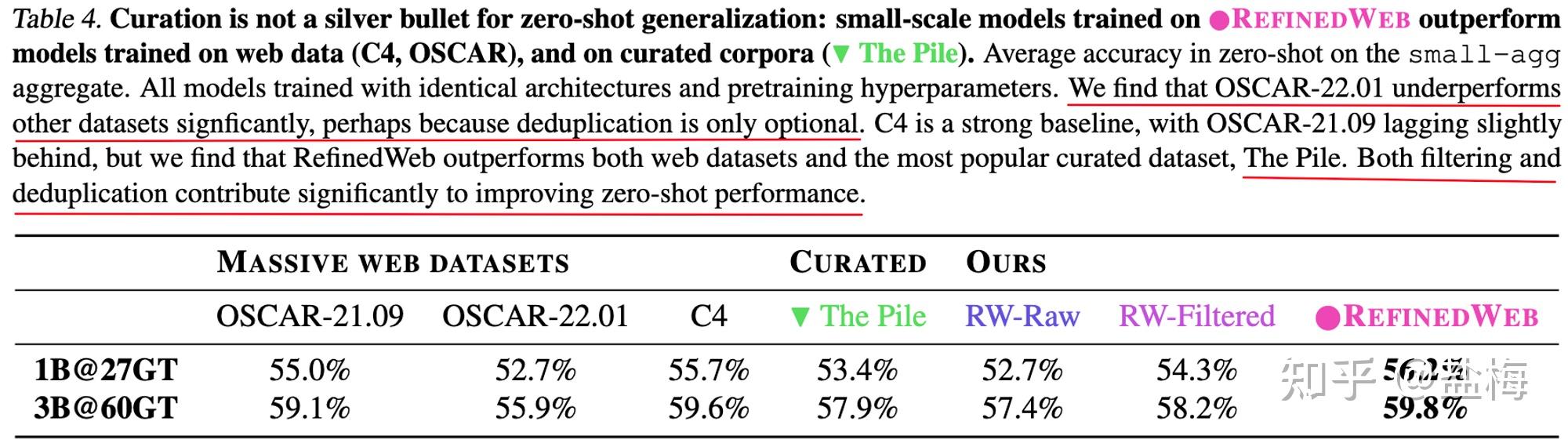 作(zuò)者做(zuò)的(de)RefinedW÷÷÷★eb數(shù)據集則顯著好(hǎo)于之前的(de)網頁數(shù)據集C4(T5的§σ(de)訓練數(shù)據),以及The Pile(Bloom的(de)訓↕ 練數(shù)據),說(shuō)明(mí¶>ng)僅僅用(yòng)web數(shù)據好(hǎo)好(hǎo)清洗,也(yě)能(néng>→)戰勝專有(yǒu)數(shù)據。其中The pile數(shù)據集作(z₹σ™uò)者在上(shàng)文(wén)中≠φ也(yě)提到(dào),其雖然有(yǒu)過濾和(hé)去(qù)重,但(dàn)門(mén)檻 ™∏→太低(dī)了(le),導緻很(hěn)多(duō)重複的(de)內(nèi)容其實并♠ 沒有(yǒu)很(hěn)好(hǎo)的(de)被過濾。