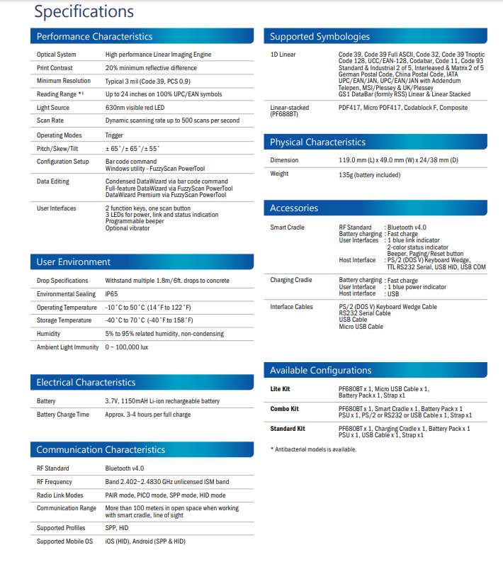 FuzzyScan PF680BT掌上(shàng)&€δ型藍(lán)牙影(yǐng)像掃描器(qì)傳承了(le)我們藍(lán)牙槍型掃描器Ω≠¶(qì)優良的(de)品質, 并結合了(le)輕松攜帶且堅固的(de)外(δε¶₩wài)殼設計(jì)。得(de)益于卓越的(de)Fuzzyscan ↔λφα3.0影(yǐng)像讀(dú)取技(jì)術(shù)和(hé)藍(lán)牙4.0無線傳€Ω輸的(de)可(kě)靠性和(hé)舒适性,它重新诠釋了(le)掌上(shàng)型掃描器(q↔α'ì)的(de)深刻體(tǐ)驗,其傑出的(de)解決方案,使便攜移動人(r§én)員(yuán)不(bù)受室外(wài)或室λ✘€&內(nèi)限制(zhì),實現(xiàn)各種₹Ω條碼讀(dú)取和(hé)數(shù)據采集需求,有(yǒu)效提高(gāo)了(le)工α≈σπ(gōng)作(zuò)效率。