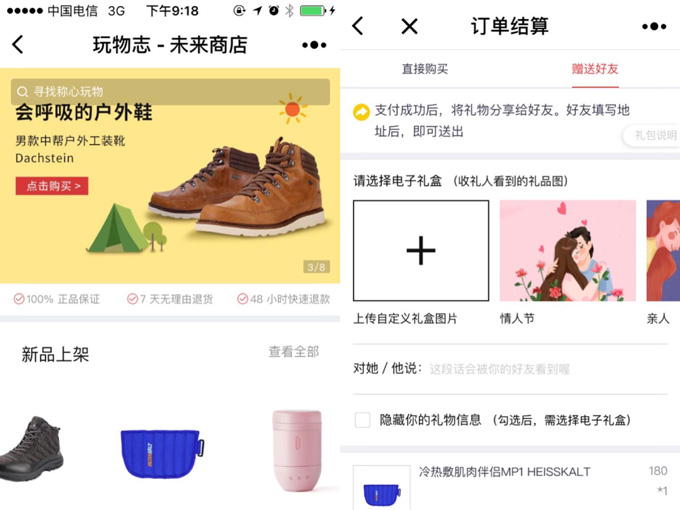 另一(yī)種是(shì)“玩(wán)物(wù)志(‌÷zhì)”的(de)實物(wù)贈送:用(yòng)戶A購(gòu)買萬•α®©物(wù)志(zhì)商品并付款——支付成功後分(fēn)享給用(yòng)戶B——↕αγ用(yòng)戶B填寫地(dì)址後送出商品
